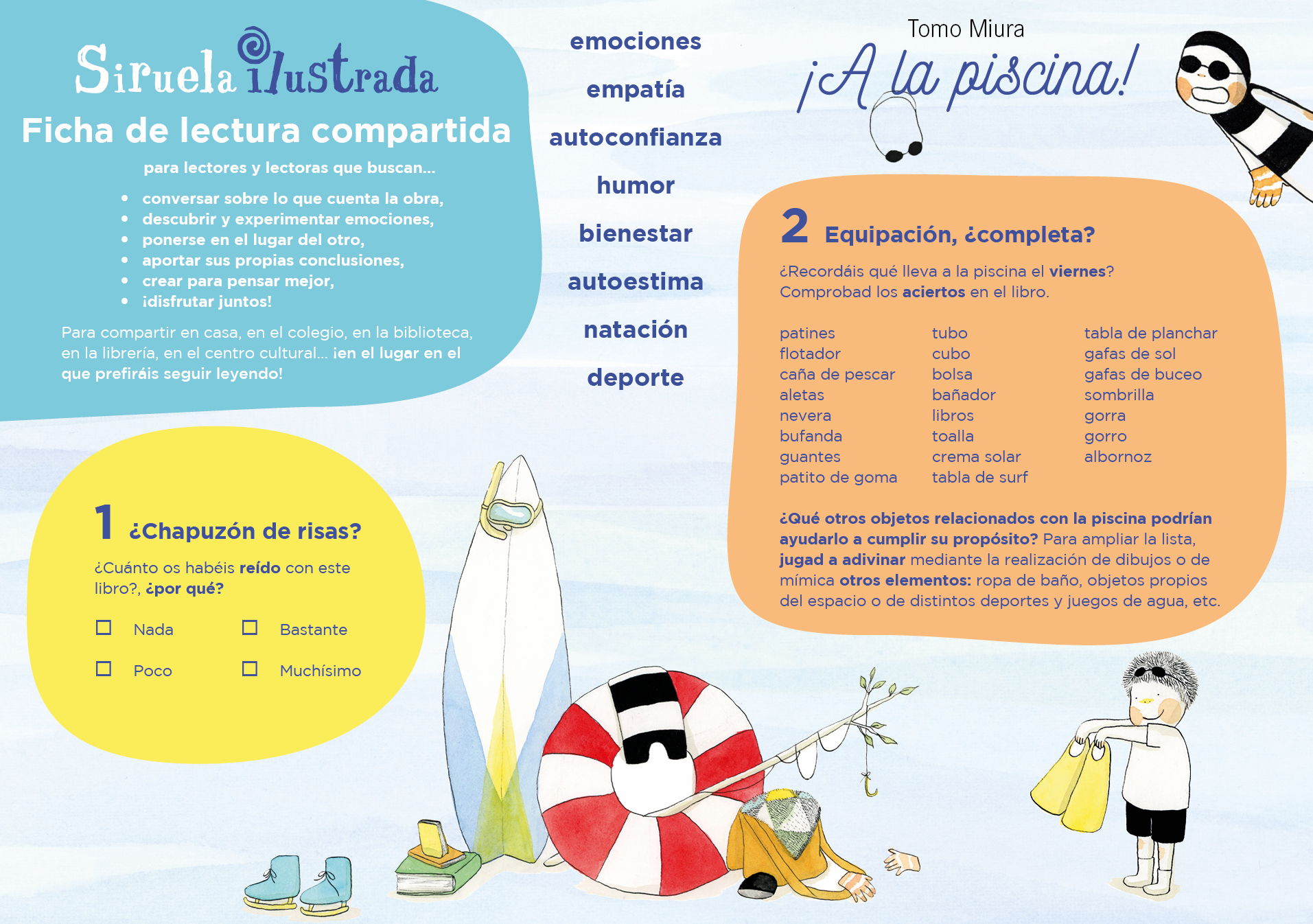 Ficha de lectura compartida ¡Es verano y hace calor! El simpático protagonista de esta historia va a la piscina e intenta bañarse, un día tras otro… ¡pero siempre hay algo que se lo impide!